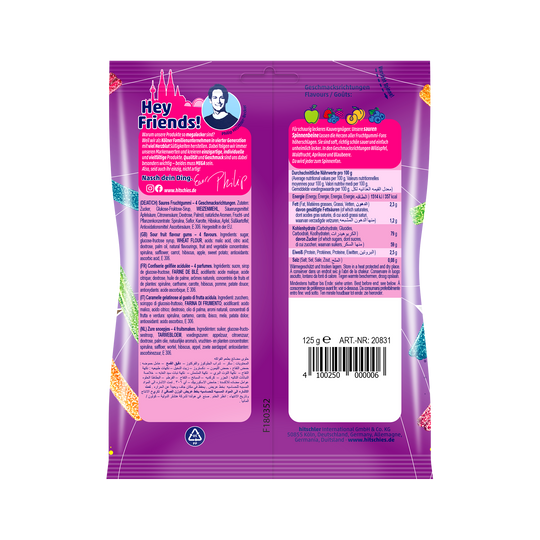 Zutaten:Saures Fruchtgummi – 4 Geschmacksrichtungen. Zutaten: Zucker, Glukose-Fruktose-Sirup, WEIZENMEHL, Säuerungsmittel: Äpfelsäure, Citronensäure; Dextrose, Palmöl, natürliche Aromen, Frucht- und Pflanzenkonzentrate: Spirulina, Saflor, Karotte, Hibiskus, Apfel, Süßkartoffel; Antioxidationsmittel: Ascorbinsäure, E 306.