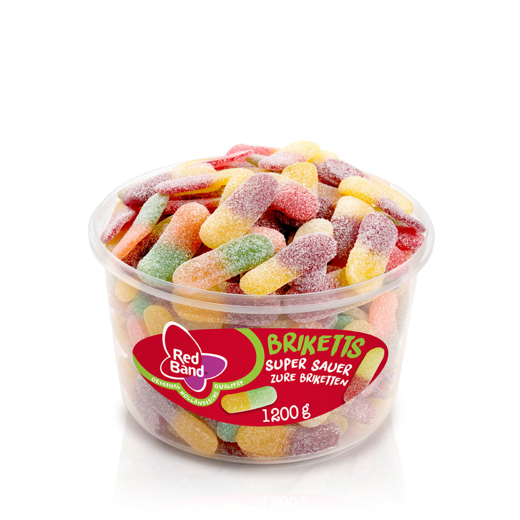 Die Red Band Briketts sind super saure, zweifarbige Fruchtgummi-Stücke in verschiedenen Geschmacksrichtungen. Dick mit Zucker kandiert, bieten sie ein intensiv saures und fruchtiges Geschmackserlebnis.